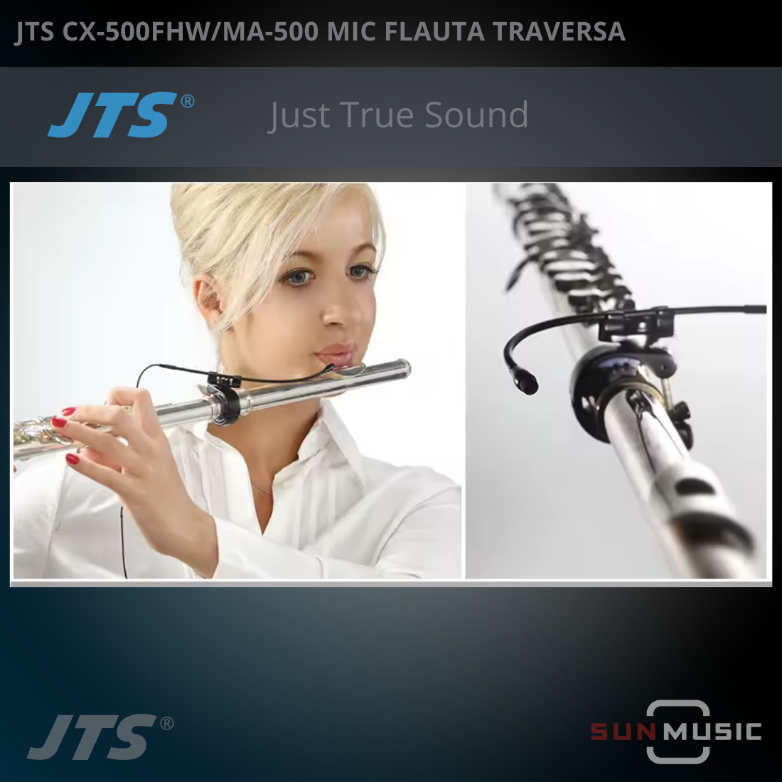 El JTS CX-500FHW/MA-500 es un micrófono de condensador omnidireccional con diadema, diseñado específicamente para captar el sonido de flautas. El paquete incluye el micrófono JTS CX-500FHW y un adaptador de alimentación fantasma JTS MA-500, que permite utilizarlo tanto de forma inalámbrica como con cable