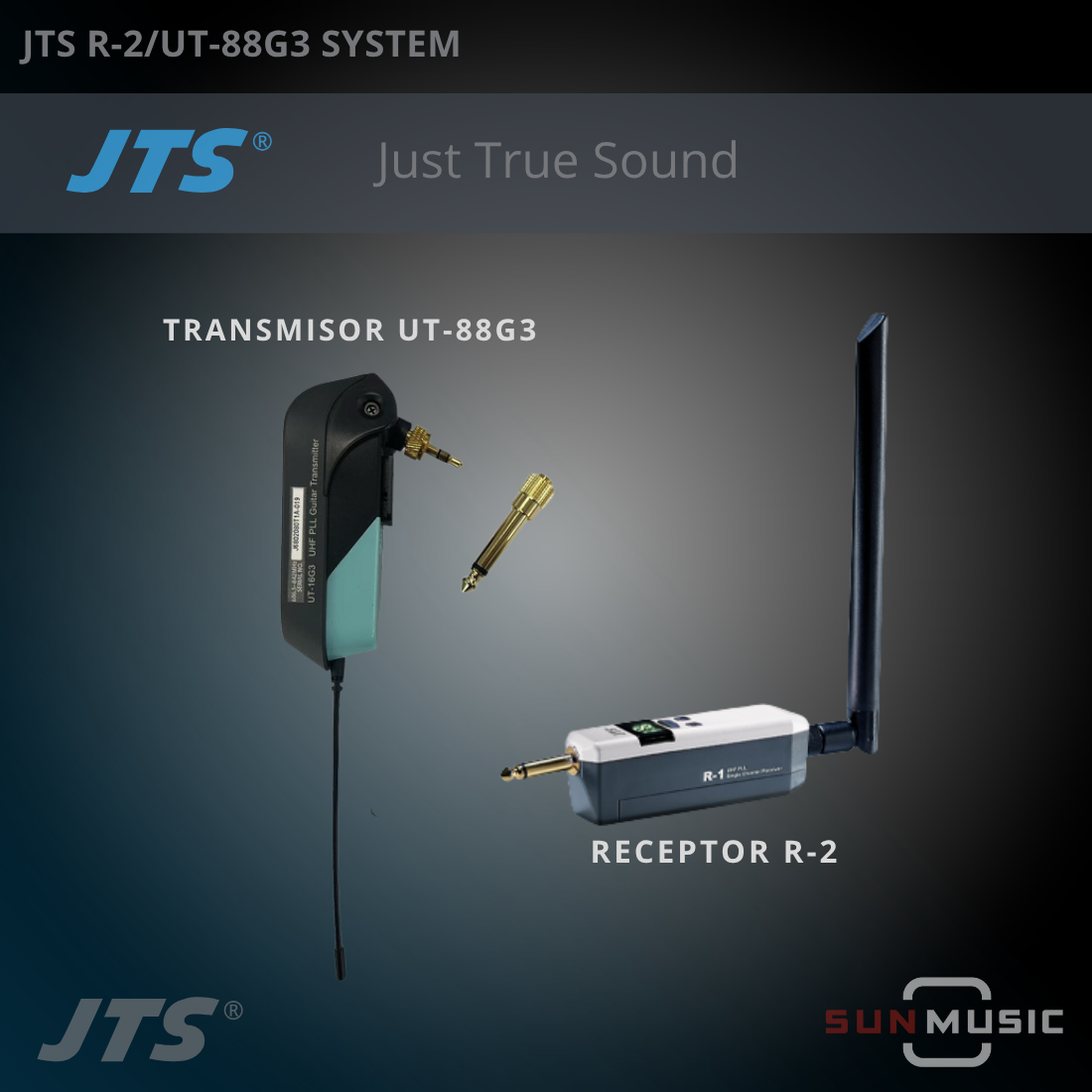 El sistema JTS R-2/UT-88G3 es un sistema de micrófono inalámbrico compacto y portátil, diseñado principalmente para instrumentos musicales como guitarras, bajos, instrumentos de viento y acordeones. Se caracteriza por su tamaño reducido, precio asequible y facilidad de uso.